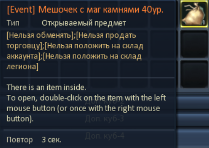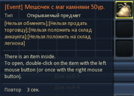 За каждые 90 мин (макс 3 шт. в день) - [Event] Мешочек с магическими камнями 40 уровня. Внутри мешочка 1 рандомный камень.