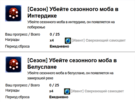 ➖ Убийство сезонных мобов (духов) в локациях Интердика и Белуслан.